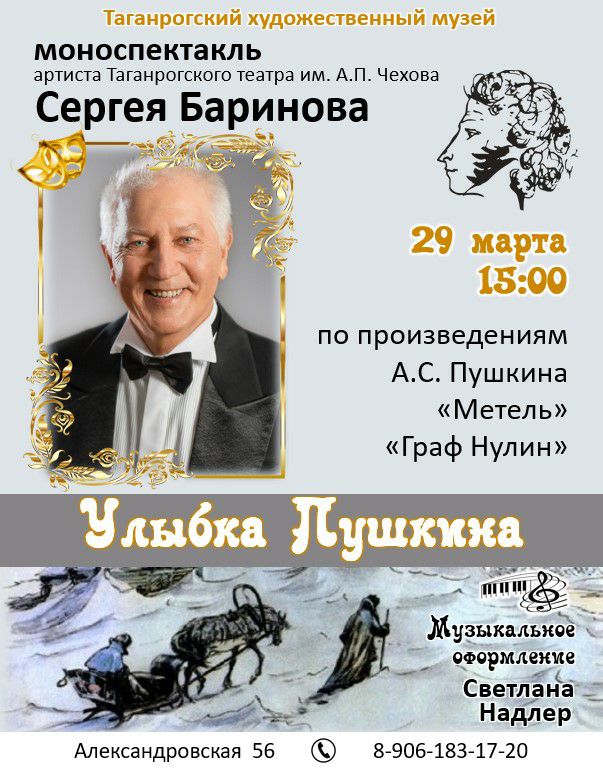 🎭29 марта в 15:00 в Таганрогском художественном музее состоится моноспектакль актера Таганрогского театра им.А.П. Чехова Сергея Баринова «УЛЫБКА ПУШКИНА». Музыкальное сопровождение — Светлана Надлер. 🎼В литературно-музыкальной программе прозвучат отрывки из произведений А.С. Пушкина и стихи великого поэта.