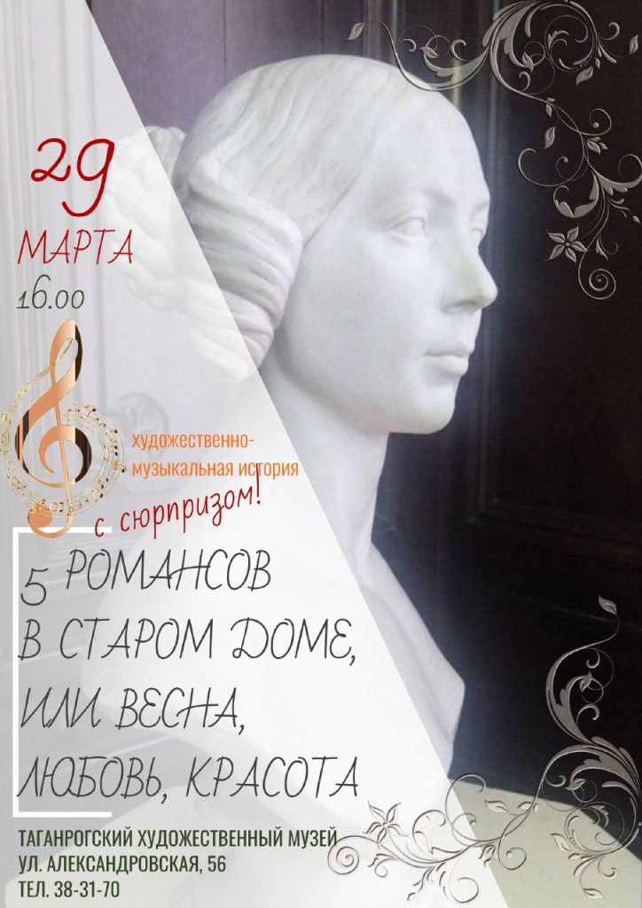 🎼🌷Яркой и незабываемой станет для вас художественно-музыкальная история с сюрпризом «5 романсов в старом доме, или Весна, любовь, красота».🏛 Старинный особняк Хандриных, где располагается музей, приоткроет для нас тайны культурной жизни его владельцев на рубеже 19-20 веков. Вместе мы рассмотрим пленительные женские образы в произведениях русских мастеров 19 века из собрания музея, насладимся великолепными музыкальными номерами в исполнении преподавателей и студентов Таганрогского музыкального колледжа — лауреатов и дипломантов вокальных конкурсов. 🙋♀Приглашаем вас на встречу с искусством!