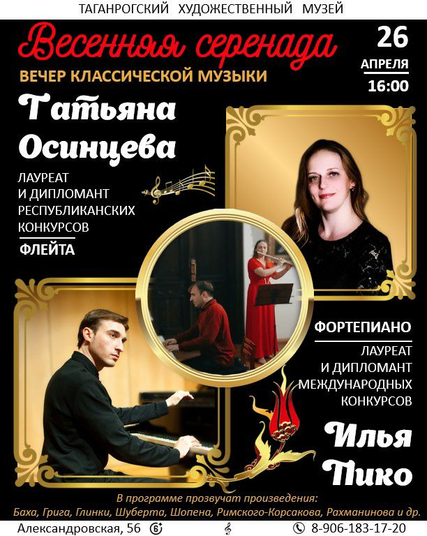🎵На музыкальном вечере классической музыки в Таганрогском художественном музее прозвучат композиции И.С. Баха, Э.Х. Грига, Ф. Шуберта, М.И. Глинки, Ф. Шопена, С.В. Рахманинова, Н.А. Римского-Корсакова и других композиторов ХVIII-ХХ вв.