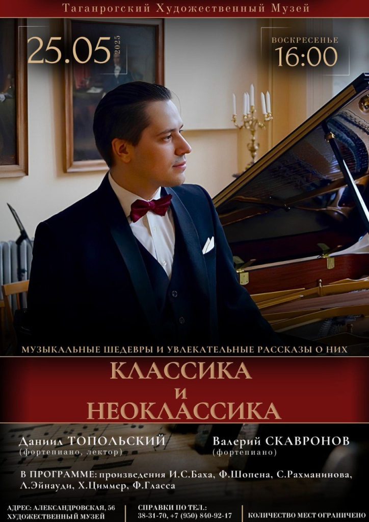 В программе музыка: И.С.Баха, Ф.Шопена, С.Рахманинова, Л.Эйнауди, Х.Циммера и Ф.ГлассаЖдем вас на 25 мая в 16:00 по адресу ул. Александровская, 56. Телефон для справок и записи: 38-31-70.