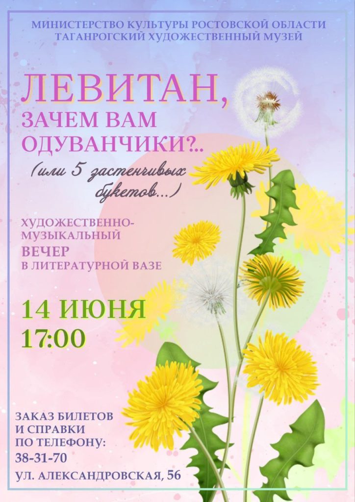 Он обещает стать особенным, поскольку мы:- собрали для вас 5 букетов из прекрасных историй, живущих в мире искусства;- обернули каждый букет яркими литературными строками;- выбрали для каждого букета подходящую музыкальную вазу… и готовы подарить вам все это 14 июня в 17.00! Мы (и одуванчики!) ждем вас в нашем корпусе «Русское искусство» по адресу: ул. Александровская, 56.