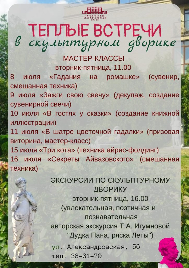 ‼️6 июля — последний день работы Таганрогского художественного музея перед закрытием его на ремонтно-реставрационные работы. Успейте завтра посетить наши выставочные пространства и ознакомиться с шедеврами русской живописи ( полотнами И.К. Айвазовского, И.И. Шишкина, В.Д. Поленова, И.Е. Репина, И.И. Левитана и многих других). В 15.00 часов состоится заключительная экскурсия по экспозиции. 🌲🌳Здание с понедельника, 7 июля, будет закрыто, но некоторое время будет открыт для посещения музейный скульптурный дворик — удивительно приятное, цветущее пространство. 🌹🌹🌹Здесь мы приготовили для вас теплые встречи — авторские экскурсии Т.А. Игумновой (вторник-пятница, 16.00) и серию мастер-классов для детей и взрослых (вторник-пятница, 11.00). Ждем вас на нашей территории искусства и доброты, в скульптурном дворике. ☝️Знакомьтесь с нашей афишей, выбирайте мероприятие для души!