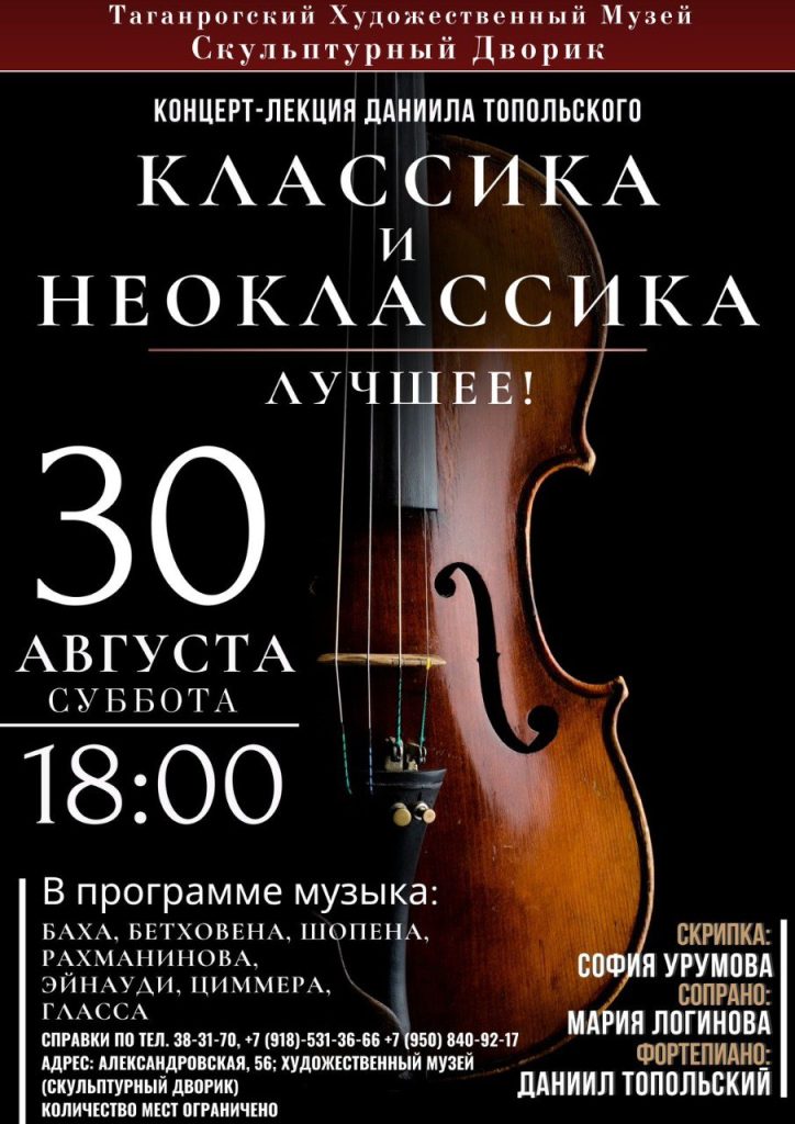 Теплым летним вечером в сказочной атмосфере скульптурного дворика Таганрогского художественного музея прозвучат полюбившиеся публике шедевры классической музыки и современных композиторов.
