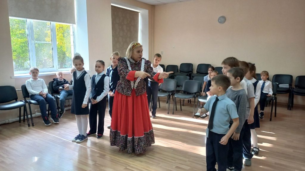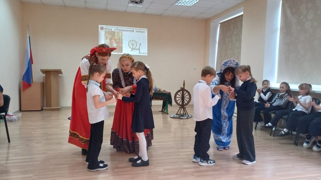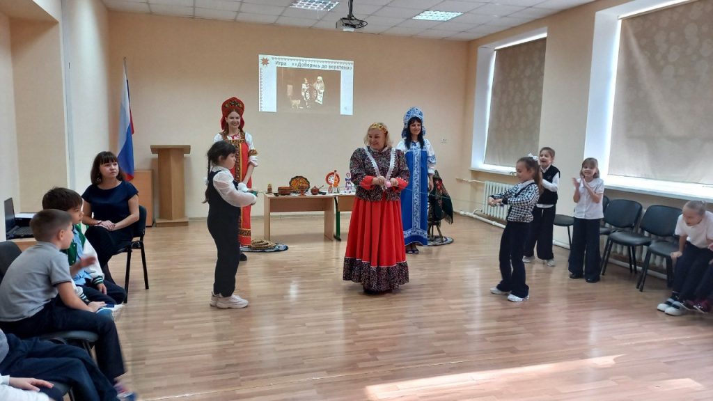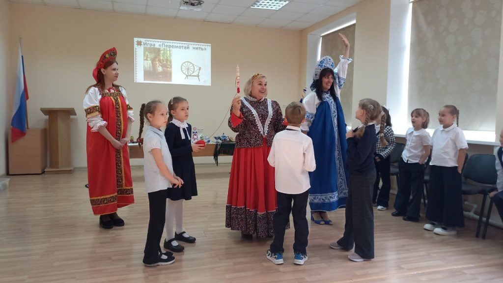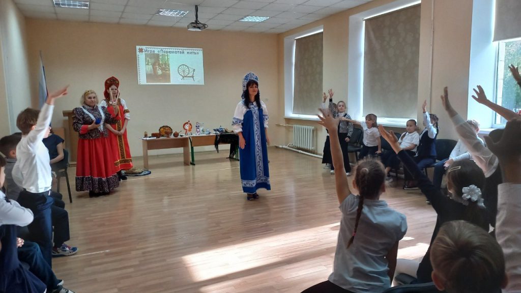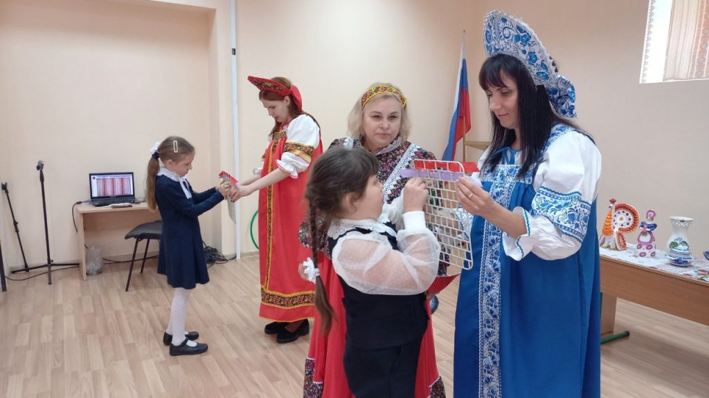 Для наглядности кроме видеопрезентации с репродукциями картин привезли: настоящие прялку и лапти, деревянные ложки, коллекцию дымковской игрушки, хохломской и гжельской посуды, клубки ниток, плетёные коврики. Многое из этого можно было не только посмотреть, но и испробовать в деле — в весёлых конкурсах и в поисках верных ответов на загадки.