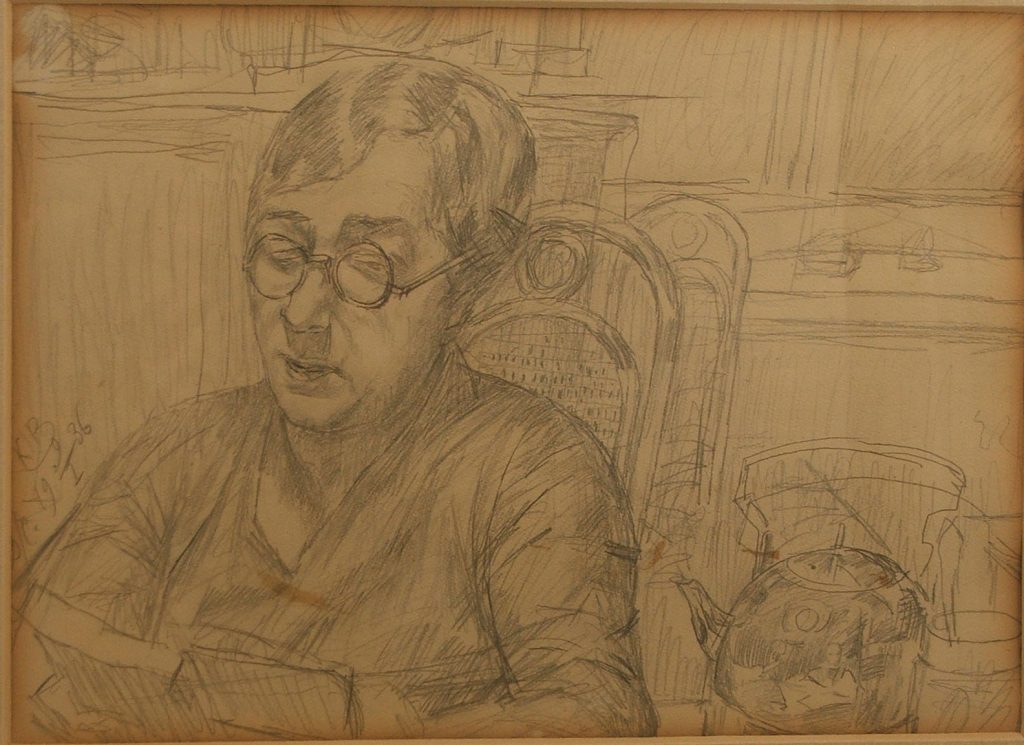 Последний портрет маслом ненаглядной Мары был написан художником в 1934 году. В 1936 году, когда был сделан карандашный портрет жены, художнику врачи запретили работать масляными красками и карандаш, был его главным инструментом для работы. Кузьма Петрович в последние годы жизни создал целую серию карандашных портретов жены, стараясь не упустить ни одного мгновения их жизни. Простая бытовая сцена. Мара, после семейного чаепития, как всегда занята домашними делами и в этом момент художник её запечатлел. Он не только мастерски схватил внешнее сходство, но главное показал внутреннюю сосредоточенность модели, её духовность. Сам художник так же присутствует на портрете. Виртуозно, вписав свое отражение на никелированной поверхности чайника, он как бы говорит: «Я всегда рядом…»