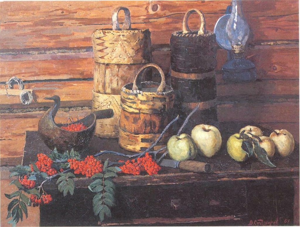 Владимир Стожаров (1926–1973), выпускник Московского художественного института им. В.И. Сурикова, вошёл в историю искусства как создатель мощного и узнаваемого стиля. Знаменитые «стожаровские» натюрморты с медной посудой, туесами, расписными прялками и лукошками, полные внутреннего тепла и монументальности, стали настоящей визитной карточкой мастера.