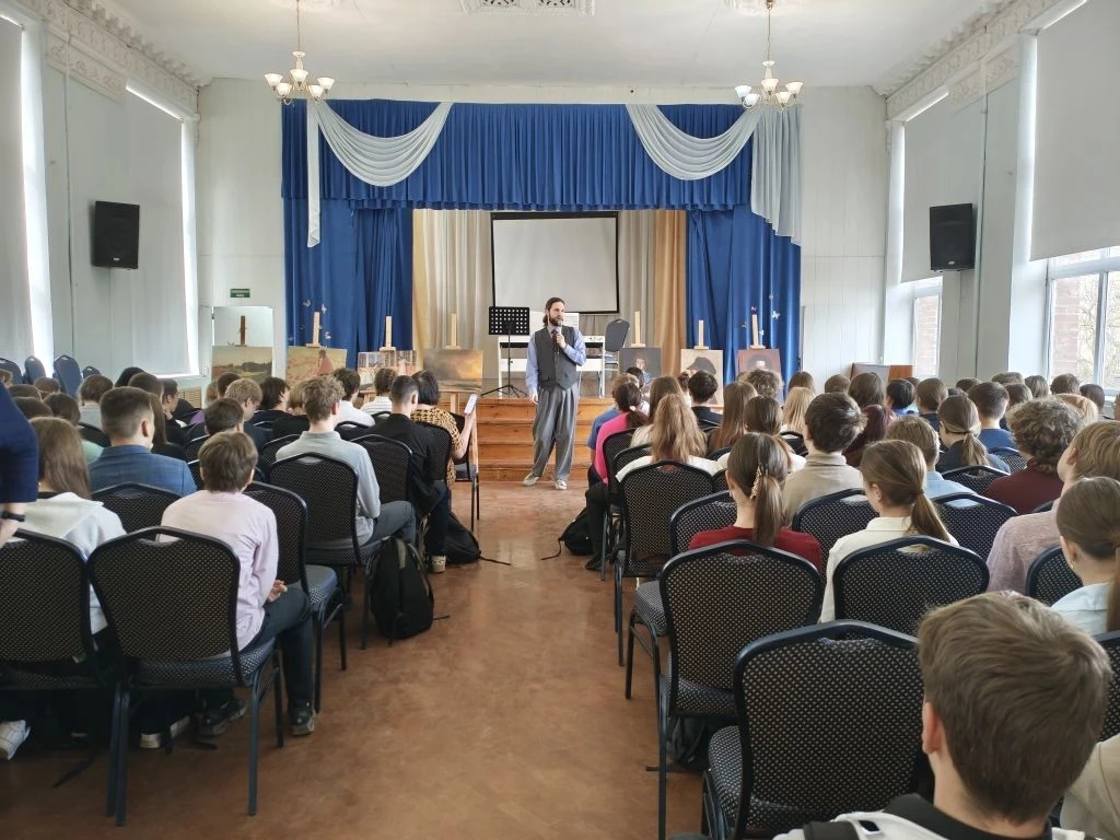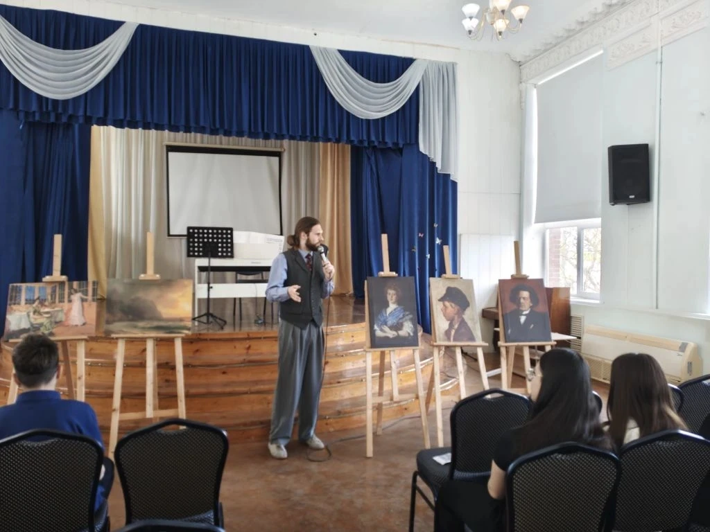 Этой же цели служит и волшебная сила изобразительного искусства. О коллекции Таганрогского художественного музея и золотых именах Серебряного века, дружбе А.П. Чехова с мастерами живописи, картинах из собрания ТХМ ученикам рассказал научный сотрудник музея Арсений Рыбалкин.