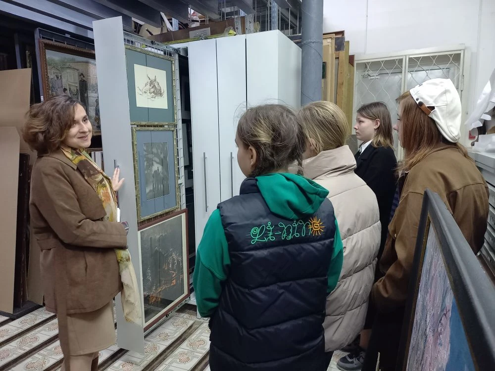 Сегодня ученики художественной школы имени С.И. Блонской, изучающие вместе с нами творческое наследие художников-фронтовиков, побывали в музейном фондохранилище. Главный хранитель музейных предметов Юлия Владимировна Николаенко познакомила ребят со структурой собрания, автоматизированной системой учета музейных ценностей и правилами хранения музейных предметов.