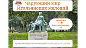 Читать далее...Дорогие таганрожцы и гости города!9 февраля в 14 00 в Таганрогском художественном музее состоится художественно -музыкальное мероприятие «Чарующий мир итальянских мелодий», посвящённое Дню памяти А.С.Пушкина. Италия в начале 19 века считалась—«страной свободы и красоты»! Великое искусство, создаваемое на протяжении многих веков в Италии, вдохновляло ни одно поколение выдающихся мастеров разных стран. Восхищался «страной высоких вдохновений» […]