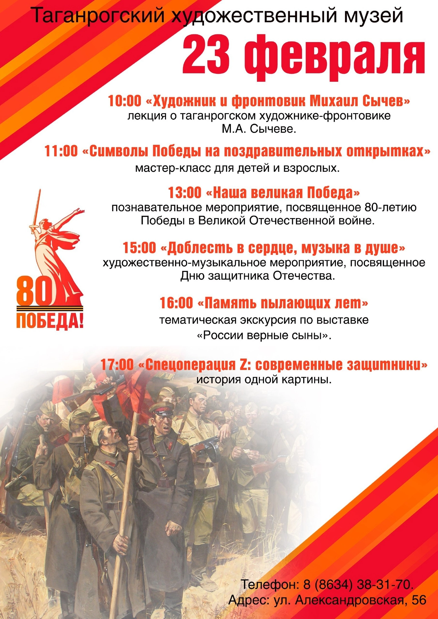 Дорогие друзья! 🇷🇺Предлагаем отметить День защитника Отечества с Таганрогским художественным музеем! 📖 Эти выходные подарят вам незабываемые впечатления и познавательный досуг, дадут возможность заглянуть в историческую героическую Книгу памяти народной и подробнее узнать о героях нашего Отечества. 🔥Для вас разнообразные лекции, экскурсии, познавательные мероприятия, мастер-классы, концерт, спектакль. Ждем всех по адресу: Александровская, 56 тел. 38-31-70#Таганрогский_художественный_музей […]