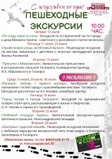 Читать далее...Дорогие друзья! Приглашаем всех вместе с нами открывать интересные места Таганрога, погружаться в его прошлое, знакомиться с жизнью и творчеством знаменитых людей, чьи имена связаны с историей города. Для вас — самые увлекательные пешеходные экскурсии от ТХМ! Встречаемся у входа в музей, у калитки в скульптурный дворик. Ул. Александровская, 56 Запись по тел. 38-31-70