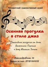 Читать далее...🎶 26 сентября в 10:00 состоится пешеходная экскурсия «Осенняя прогулка в стиле джаз». Маршрут экскурсии начинается у здания Таганрогского художественного музея и проходит через дома музыканта Валентина Парнаха и поэта-песенника Михаила Танича. 🏛️Старт экскурсии: Александровская, 56. ☎️ Запись по телефону: +79185364078.
