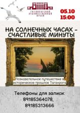 Уважаемые жители и гости города! Уже и на наших солнечных часах октябрь. Давайте же не будем терять времени! Превратим этот месяц в самые счастливые минуты (часы!) вашей жизни с Таганрогским художественным музеем, посетив наши пешеходные экскурсии! Счастье стартует 10 октября в 10 утра от дверей нашего музея по адресу: улица Александровская, 56. Запись и справки […]